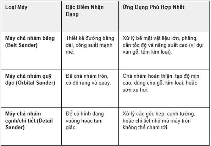 Chuyển động: Với các dòng máy quỹ đạo (orbital), đế chà nhám không chỉ quay mà còn rung theo một quỹ đạo lệch tâm. Chính điều này giúp tăng tốc độ mài nhẵn, đồng thời giảm thiểu các vết xước xoáy (swirl marks) thường gặp trên bề mặt vật liệu.